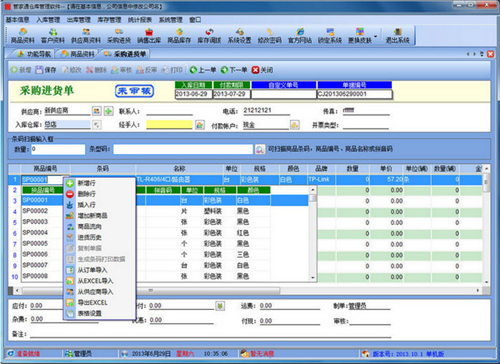 2、入库管理:进行货品采购入库,采购退货,进货单据和退货单据查询,供应商往来帐务,供应商付款。
