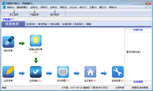 优图广告公司业务管理软件官方版是一款功能丰富而实用的广告业务管理软件,软件界面设计简洁、美观、内容丰富、操作简单明了。为广大广告行业管理者量身打造集员工管理、客户管理、业务管理、采购管理、仓库管理、财务管理、办公管理、报表打印等为一体,是一套优秀的系统软件。 软件注重提高工作效率,是管理者的好帮手!
