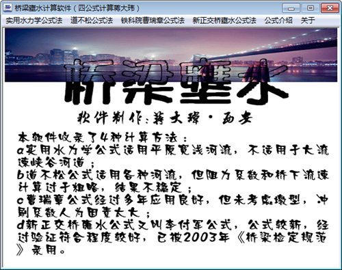 桥梁壅水计算软件官方版是是一款功能强大,操作简单的桥梁壅水计算辅助工具,软件界面友好使用方便,不用复杂的操作,极易上手。内置了桥梁壅水四公式计算、水库调洪、梯形断面计算、发大洪水过程、西北黄土高原地区不冲不淤断面设计五个工具,你只需要输入相关的参数就能快速得到结果,不需要编辑公式,更不需要手算,直接得到结果,大大节省了工作人员的工作时间。