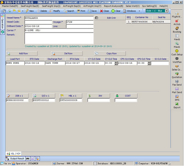 ??7、报表分析:损益报告、商业分析、运输吨数统计、TEU摘要统计、营业员营业统计、客户商业活动分析等报表。