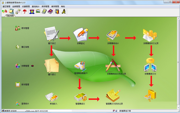 功能模块:按入墓时间查询,按墓穴位置查询,未出售的墓穴,墓穴交费到期,墓区预定提醒。