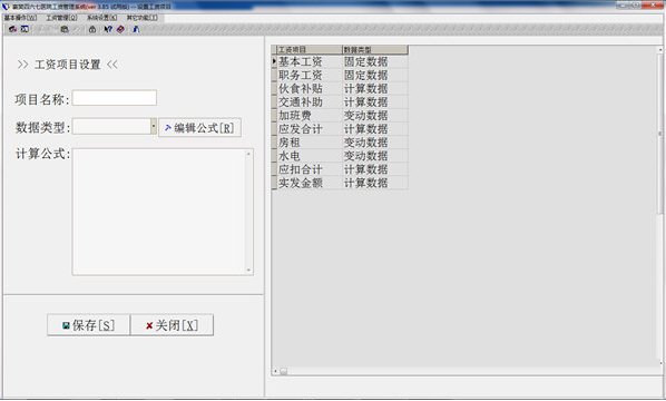工资项目可以完全自定意义,并把所有的工资项目分为固定数据、变动数据、计算数据三类处理,固定数据如基本工资、职务工资等,这些一般不变动,在本系统里设置好后,每个月产生工资时这些工资项目会自动填入。