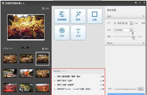 | 介绍 | 美图秀秀批处理 2.1.2.0 官方版免费波涛惹人前所未有喜爱汹涌17. 遇见靠的是缘分,相守靠的是用心,不是所有的相遇都是一场怦然心动,也不是所有的情缘都能相伴一生。以前的完美,越来越模糊;以前的时光,越来越凌乱。不是不想念,而是太感性怕忧伤了的眼睛;不是不怀念,而是不敢去触碰那回不去的以前。这个城市位于长江畔。338.兼听则明,偏听则暗。宋?司马光 《资治通鉴》 美图秀秀批处理是一款由美图秀秀推出专门用于图像编辑处理的美图秀秀批量处理软件,使用这款官方工具可以让你一键编辑许多图片的尺寸,像素,大小等具体操作,马上下载体验吧。 ![]() 基本简介 美图秀秀是一款很好用的免费图片处理软件,不用学习就会用。美图秀秀拥有的图片特效、美容、拼图、场景、边框、饰品等功能,加上每天更新的精选素材,可以让你1分钟做出影楼级照片,还能一键分享到新浪微博、人人网……在各大软件站图片类高居榜首的美图秀秀,目前已有1.2亿人正在使用,赶快下载安装吧! 软件优点 ![]() 软件截图2 ☆ 不用学习,使用超简单 ☆ 1分钟做出影楼级照片 ☆ 海量精选素材每天更新 ☆ 一键分享到各大社区 功能介绍 点击美图秀秀的批处理功能后,弹出批处理功能界面,我们可以一览美图秀秀批处理功能的概况,该功能支持多图添加、文件夹添加以及图片鼠标拖拽。批量处理工具主要具备如下几个功能特点: 一、照片基础调整: ![]() 软件截图3 在批处理基础调整功能中,分为自定义模式和设定模式(鲜艳、清晰、明亮),即用户可以自定义微调各个参数选项,给予用户最大的自由度,随自己的修图喜好把握照片的风格;同时,也可以按照软件工具的给予参数设定处理照片。当然,在设定的模式中,参数并非固定死板的,仍旧可以微调,这两种模式主要包含六项照片调整项:亮度、对比度、饱和度、清晰度、色相、智能补光,基本覆盖了一张照片曝光、层次、色彩、锐度等调整要素,考虑很周到。 二、特效添加: ![]() 软件截图4 对于在同一场景下拍摄的一系列照片,如何把握照片后期调色风格的统一性,相信大家都有共识,那就是各项修图参数基本一致,这样修出来的照片在整体风格、氛围上才能协调统一,这就是批处理的优越性。反之,一张张对照片进行处理,风格把控上就会显得混乱许多,对于初级入门摄影爱好者来说,经常会陷入此误区。而批量处理工具提供的特效数量多寡与质量高低,也是摄影爱好者关心的问题。 美图秀秀批处理提供有20多种特效,选择非常丰富。其中包括自然亮白,自然亮肤面向人像的处理特效,也包括锐化,去雾等基础调整类特效,剩余的更多是照片风格特效,比如LOMO、旧时光、后青春等等有12种之多。这些特效是精选的美图秀秀电脑版的热门经典特效,画质和效果出色,在与照片融合度上也有不错的表现。 三、水印添加: ![]() 软件截图5 一个有个性的摄影师或者摄影爱好者,我们总能一眼从照片看出出自何人之手,因为他们形成了自己独有的拍摄风格。除了照片风格之外,还有什么方法可以鉴定照片是何人所拍呢,毫无疑问,那就是水印了。水印就像一个人的名片,是身份标识,也是版权所有标识,将制作好的水印压在照片上,能让人一眼得知照片出自何人之手。 通过批处理工具的水印功能,我们能够对水印的大小、旋转、透明度以及水印位置进行自由控制,同时,在调节水印的时候,可以轻松预览,即时看到水印效果;此外,该工具有记忆功能,之前导入过的水印都留存在水印功能板块的下方,方便随时调用。 四、边框添加: 很多摄影爱好者都喜毁方瓦合拼音:huǐ fāng wǎ hé释义:毁去棱角,与瓦砾相合。比喻屈己从众,君子为道不远离于人◇指毁弃自己的原则,迎合世俗。出处:语出《礼记·儒行》慕贤而容众,毁方而瓦合,其宽裕有如此者。”郑玄注去己之大圭角,下与众人小合也。”示例:故《儒行》欲~,《老子》欲和光同尘。★宋·俞文豹《吹剑录》欢给自己的照片加上边框,这样可以让照片看起来更专业,更具艺术性。美图秀秀批处理提供这一功能,批量拖拽、批量添加,15种各式风格的边框,黑框、白框可自由选择。 五、文字添加: 当一张照片不足以讲述一个故事的时候,我们希望能在照片上加上一些文字辅助说明,这个时候文字的添加就会显得很有必要,美图秀秀批处理功能也提供了这一功能,操作很简单,输入文字,选择字体风格,透明度,自由拖放文字位置即可。 六、可逆性操作: ![]() 软件截图6 当你在对照片做完几个大项的功能调整之后,突然发现,这个调整还不够完善或者完全没有调整必要,那么我们可以返回菜单主界面中“我的操作”选项中进行二次编辑或者删除操作,也可根据需要自行保存操作步骤,以便下次使用。 七、保存设置: 当以上的五大项批处理功能调整完毕确定时,我们需要对照片进行保存前的最后调整设定,美图秀秀批处理工具能够对照片的输出尺寸大小、照片格式、画质等级,是否重命名,存放位置进行设定。很显然,这些功能都是相当必要的,美图秀秀批处理功能怎么可能遗漏呢!最后,点击保存之后,照片的批处理功能就正式启动了,稍等片刻就能看到批处理照片的效果了! 八、批量处理照片数量: 另外,美图秀秀批量处理功能很强大的一个地方在于:批量处理照片数量上可以达到500张之多。面对日常的上百张照片一并批处理