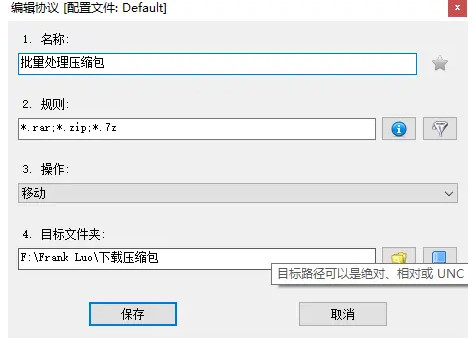 批量处理压缩包,.rar;.zip;*.7z需要填写的后缀名,所需要做的操作是把它们移动,移动到目标文件夹下。