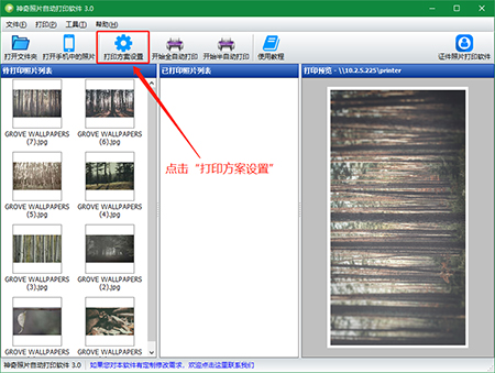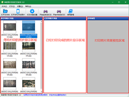 第三步:点击工具栏“开始全自动打印”或“开始半自动打印”按钮,选择一个打印方案,即可开始打印,已经打印完成的照片会显示在“已打印照片列表区域”。