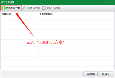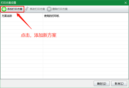 第二步:设置打印方案,点击工具栏“打印方案设置”按钮,弹出打印方案列表,点击“添加打印方案”按钮,新增打印方案,界面如下: