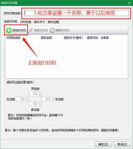 第二步:设置一个方案名称,便于以后使用,然后添加一个打印机,作为此方案使用的打印设备,如下图所示: