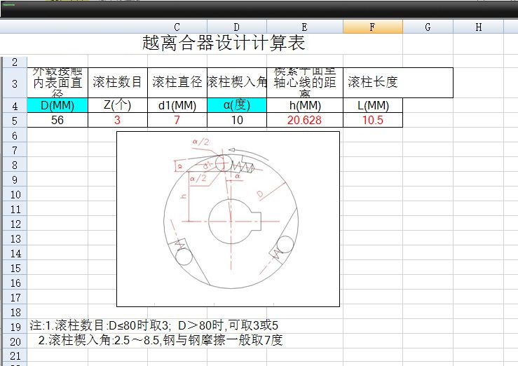 3、超越离合器设计计算工具官方版界面显示数据范围提示,滚柱数目:D≤80时取3; D》 80时,可取3或5