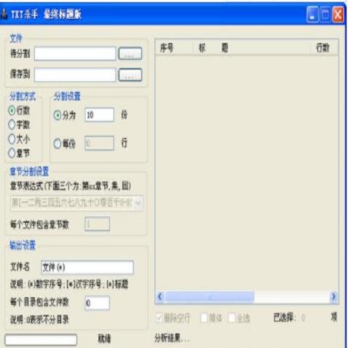 TXT杀手是专门为热爱小说的朋友们推出的文本分割软件,其支持ANSI格式编码,可以选择按照章节、行数、字数、大小分割,按大小分割的时候可以分割任意类型的文件,可以当作万能分割工具使用,多线程,分割速度快。