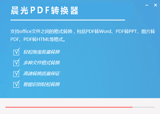 4.晨光pdf转换器中文版转换效率高:晨光pdf转换器采用了最新的超远程转换技术,超线程技术的出现大大提高了软件的转换效率,深度的解析和识别更好地保证了转换质量。简单清爽的操作界面,只需轻轻点击“开始转换”按钮,即刻一键转换。而且搭配多核心CPU强大的处理能力,可以在短时间之内完成大量文件的转换。