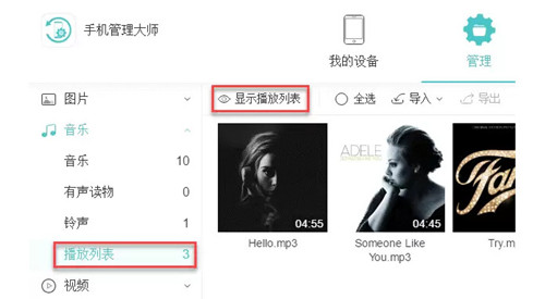 点击手机管理大师主界面上的“管理”按钮,可以看到所有文件选项,接下来就可以开始管理手机资料了。进入相应的目录,点击“导入”,可以选择“导入文件”或者“导入文件夹”。