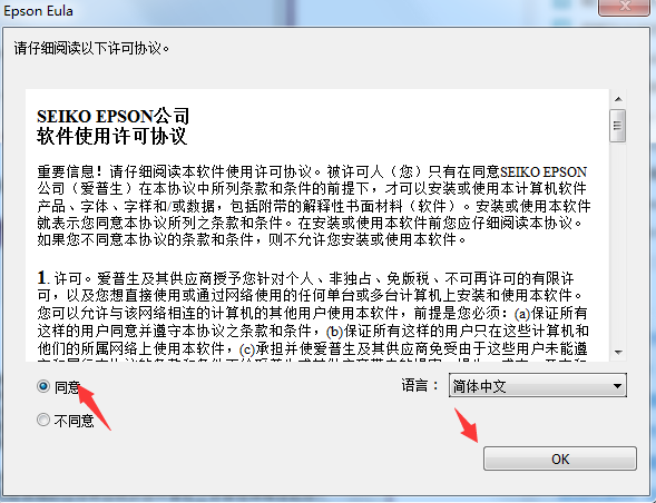 4、弹出软件使用许可协议,选择语言简体中文,勾选同意,点OK