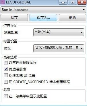 3、运行LEGUI.exe可进行转区配置,我们常用的就是转日语Run in Japanese了