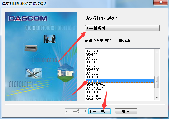 4、选择打印机系列和打印机型号,点击下一步