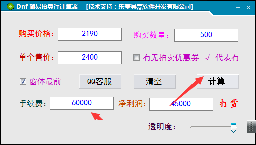 5、点击计算按钮,提示出售的价格手续费是60000,获得的利润是45000