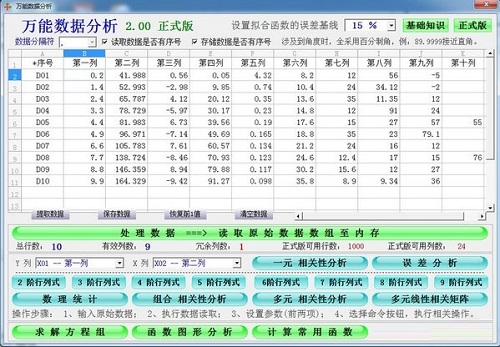 万能数据分析官方版是一款小巧便携、界面清晰的函数分析软件,主要用于分析估计参数的值线性、多元、多项式、指数和非线性函数。万能数据分析只需可进行二元线性与非线性相关分析,数理统计与误差分析,计算行列式的值、求解多元方程组,学习与研究函数的图形及特性,计算常用函数等等。