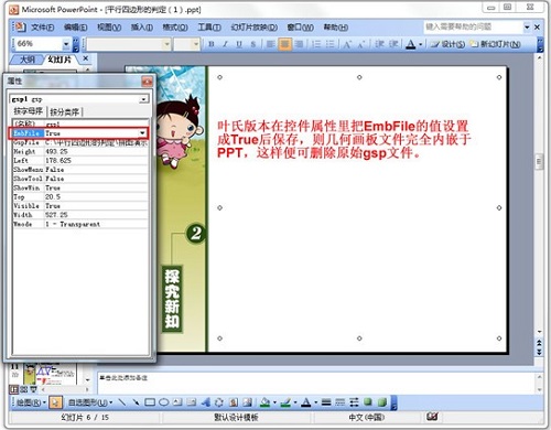 5、如果在PPT里使用几何画板控件嵌入几何画板文件,注意制作时用哪个版本的控件那么打包时也务必选择同一个版本的控件,不然无法运行(叶氏版本制作时可选择内嵌方式,即嵌入后可删除原始gsp文件,具体方法见控件教程)