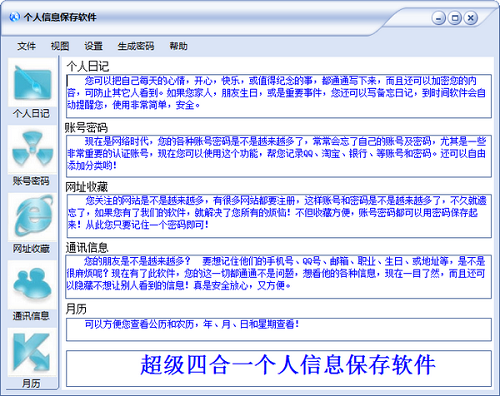 三、个人信息保存软件是一款多功能于一体的集合,有了此款软件您相当于同时拥有了个人日记,账号密码、网址收藏,通讯信息,这四款软件的功能,而且还可以把您不想让别人看到的某一条信息或所有信息都加密起来,只有分别有一级密码(软件登陆密码)和二级密码(信息加密密码)的您才能看到。这对您的个人隐私更加安全。