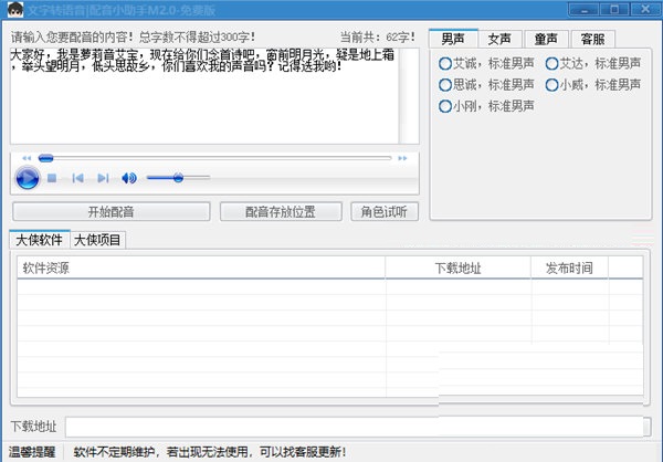 配音小助手官方版是一款十分受欢迎且专业实用的文字转语音工具,配音小助手官方版软件支持男声女声童声三大类多种声音转换,一次支持上千字数,能够帮助用户朗读文件或者进行广播。
