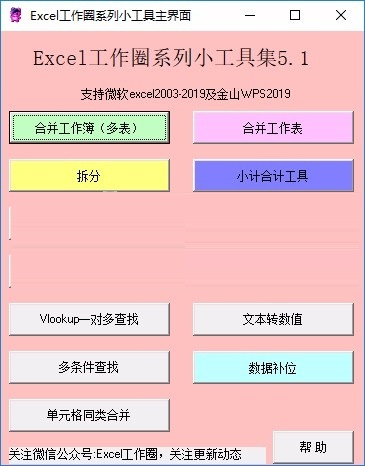 Excel工作圈系列小工具正式版是一款功能强劲实用的办公软件,Excel工作圈系列小工具正式版提供一键处理数据功能,帮助用户快速合并数据,软件自动读取电脑已经安装的Excel软件,自动对打开的表格数据处理,如果检测到表格有多个工作表就可以点击合并功能,软件会将工作表合并为一个文件,方便用户汇总数据。