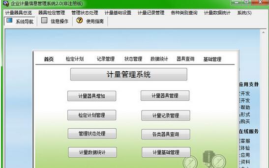 系统的主要模块有: 检定台账、库存台账、年检定计划、月检定计划、历史检定记录、漏检提醒、内部检定记录、外检定记录、强检与非强检台账、停用器具台账、降级器具台账等