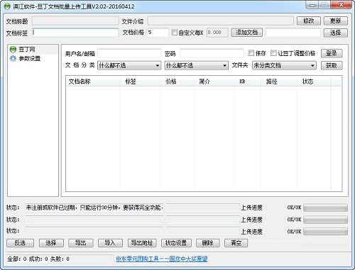漠江豆丁文档批量上传工具电脑版是款功能高效且实用的文档批量上传工具。漠江豆丁文档批量上传工具电脑版支持3个线程同时上传文档,上传速度非常快,支持用户的无限制切换和完美数字验证码识别,支持用户的无限制切换和完美数字验证码识别,支持3个多线程文档批量上传,多种格式急速上传,支持文档标签自动获取,文档分类自动获取。