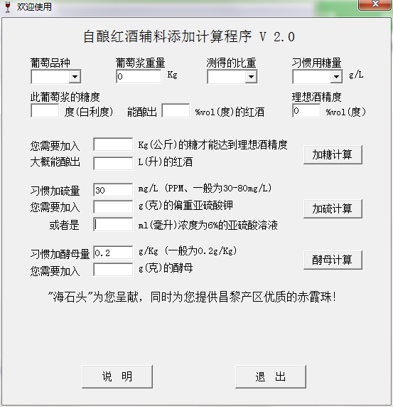 自酿红酒辅料添加计算程序中文版是一款非常强大实用的自酿红酒辅料添加的参数计算辅助工具。自酿红酒辅料添加计算程序非常的简单好用,能够帮助轻松计算出酿红酒辅料添加的参数比例,让你轻松的自己制作红酒。用户在酿红酒的时候,输入一些原始的简单的参数,就可以计算出其余的辅料参数出来,帮助用户精准酿酒。
