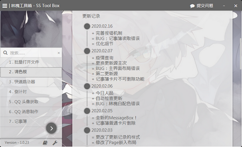 SS Tool Box官方版是一款功能丰富的杂类工具箱软件,SS Tool Box官方版能够帮助用户进行一些简单的工作,像是批量打开文件、调色板、QQ头像下载、APP图标获取等功能,未来还将添加更多功能,重要的是,它是 SS 第一个用来学习和练习 WPF 应用的程序。