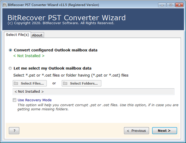 Outlook安装不是必需的。您不需要Outlook安装来执行pst文件转换。软件将读取和解析Outlook