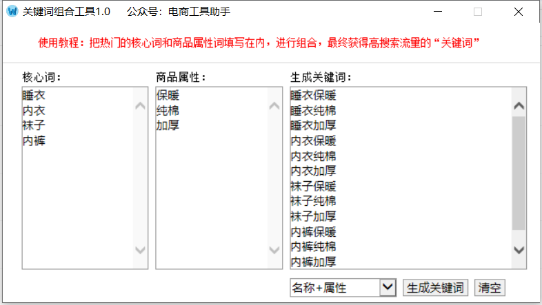 关键词组合工具官方版是一款功能强劲实用的标题生成工具,关键词组合工具官方版页面简洁直观、上手非常容易操作!能够根据给出的两组关键词来生成所有的组合标题,一般多用于电商商品标题生成。