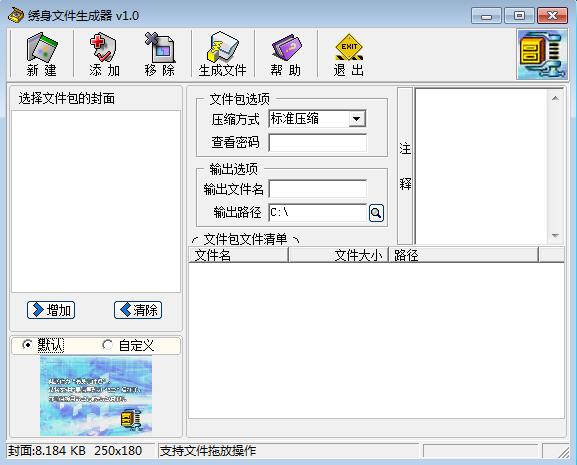 绣身文件生成器官方版是一款便捷好用、小巧专业的压缩软件,绣身文件生成器官方版可以简单的把文件包添加到图片文件中去,图片文件可以正常打开,将图片文件的扩展名改成ZIP文件后,文件就可以用WINZIP或WINRAR程序打开,将显示的网络图片下载到本地后改成ZIP文件可以用压缩软件打开其中的隐藏内容。