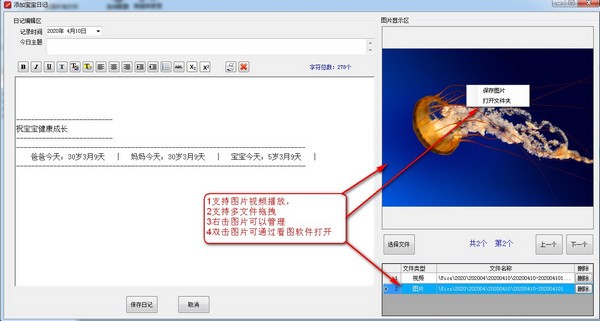 1、添加日记:每篇日志中都可以自动插入家庭成员年龄,可以批量添加图片及视频,并可同时观看,双击文件可实现通过相关软件查看,方便又实用;