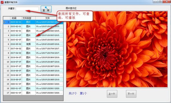 4、文件查看功能:按时间顺序排列统计出所有图片、视频文件,并支持查询;
