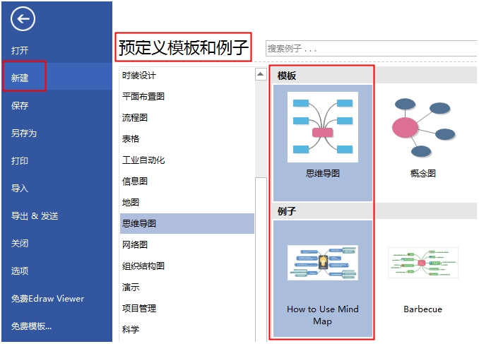 1、打开亿图软件,点击新建,在“预定义模板和例子”中选择所需的绘图类型;