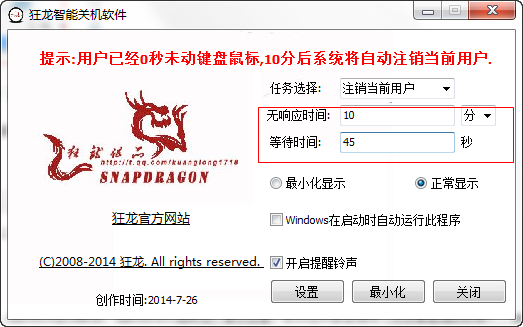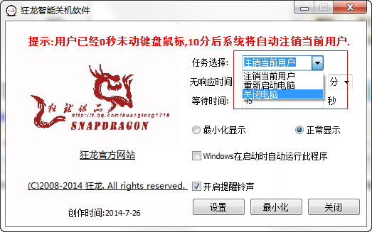 狂龙智能关机软件中文版可以在键盘鼠标同时无响应的时候,完成以下动作(功能):按时自动重启电脑,按时自动关闭电脑,按时自动注销用户。其它设置:执行任务前先询问(可设置等待的秒数),开机自动运行,运行时自动最小化和运行时自动开始上次设置的任务。本软件短小精悍,很实用,它还是一个绿色软件,只有一个执行文件,绝不会在系统中加入任何垃圾文件。