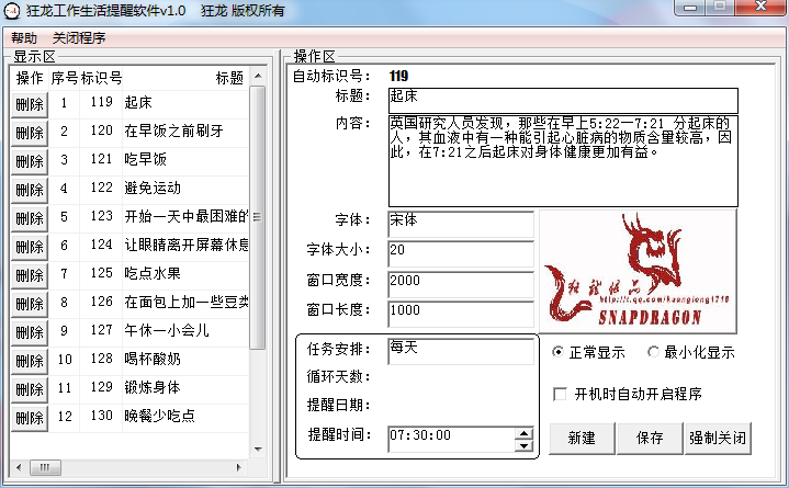 狂龙工作生活提醒软件正式版是一款体积小巧、简单便捷的生活提醒软件,狂龙工作生活提醒软件正式版也是一款定时提醒软件,能够在电脑开机后显示在我们的桌面上提醒自己今天需要做什么,怎么做等。让用户方便、高效的做出自己的安排。