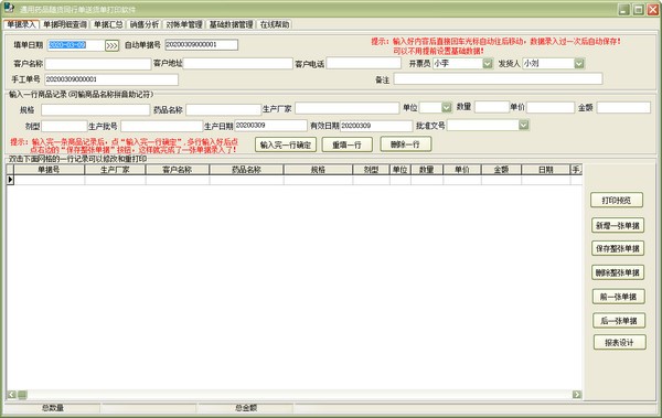 通用药品随货同行单送货单打印软件官方版: 主要面向医药行业药品行业销售开单,出库开单,医药批发开票场所,支持套打功能,支持三等份二等份打印功能,支持智能自动分页功能,支持药品编号输入或扫描功能。