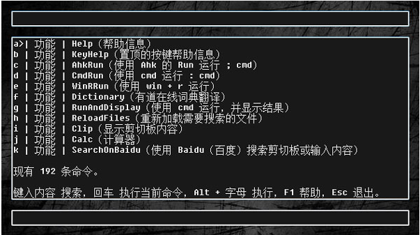 键入内容 搜索,回车 执行,Alt + 字母 执行,Esc 退出