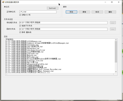 正则批量处理文件绿色版是一款简单实用的正则文本处理小工具,它可以支持通过正则表达式匹配文件名,并支持批量对文件进行移动、删除、复制等操作,批量处理文件提高效率!使用特别的简便,使用正则表达式匹配文件名,匹配更准确。