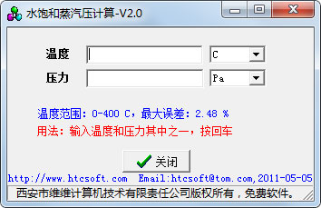 水饱和蒸汽压计算绿色版绿色免费,使用简单方便,输入温度和压力其中的任意一个,按下回车,另一个就自动计算出来。在广阔的温度范围:0-400 C内,最大误差:2.48 %。