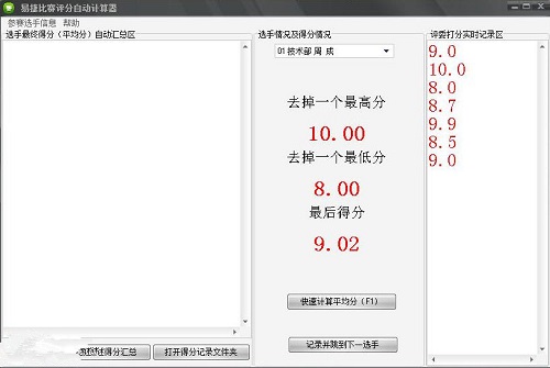 易捷比赛平均分快速计算软件官方版简单、易用、快速,广泛用于各种比赛活动、竞赛活动等选手得分计算器。软件自动去掉一个最高分、一个最低分,并计算平均分。可以在主持人报分结束后同步出结果,避免人工用普通计算器计算慢而且容易出错的问题。软件可以对所有参赛选手的最后得分进行排序,还可以对所有参赛选手的原始得分进行记录,还可以打开成绩记录文档后打印等。