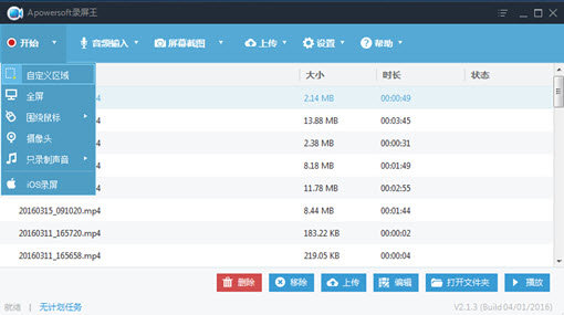 Apowersoft录屏王 2.3.4.0 免费版免费冰封大一龙马精神视同仁地42. 人一生遇见太多人,即使有些话字字诛心,也没必要活在他们的眼神里,只要内心澄明,就永远不用讨好一个不懂你的人。88. It is greatly important to try to keep a good relationship with other classmates. (2013.广东)王安石283.千门万户曈曈日,总把新桃换旧符。《元日》 Apowersoft录屏王是一款灵活的免费录屏软件。它为用户提供诸如自定义区域、全屏、围绕鼠标、摄像头等等录制模式。此外它也提供三种声音输入:系统声音、麦克风声音、系统声音和麦克风,这为想要录制解说、唱歌、教学音频等不同需求用户提供了极大的便利性。 编辑推荐:嗨格式录屏大师 录屏完毕后,您可以播放及重命名录制好的视频文件,以便以后更方便定位视频。同时您能够使用视频编辑功能,对视频进行切割、旋转、特效添加及编辑字幕和水印等等。如果您想要将录制好的视频导入到移动设备中,还可以使用转换功能,将该影片转换成设备兼容格式。 除了基本的录屏功能外,您还可以使用它内部的截图工具,将重要的画面截取并保存到指定路径中,以便您可以随时随地的找到重要的图片。 如果您需要临时外出,不用担心,设置好计划任务的开始时间和结束时间,即便人不在电脑前,还是可以将重要的会议录制下来! 对于想要将视频与他人分享的用户来讲,内部的上传功能可以让您将视频一键上传到视频分享网站,即时的推送给您的亲人、好友,不会让他们错过您人生中每一个精彩的瞬间!  Apowersoft录屏王 2.1.5 免费版 更新内容 1. 通过计划任务录制摄像头时支持隐藏预览画面;2. 修正了摄像头画面无法录制成GIF文件的问题;3. 其它细节优化和问题修复。  更新日志: 1. “音频输入”菜单内添加音量预设功能,并实现预设音量和录制中音量的同步; 2. 调整主界面上按钮的位置; 3. 修复某些情况下录屏完成时不能生成视频的问题("Processing 100%"); 4. 设置界面上增加一键打开输出文件夹功能; 5. 缩小默认鼠标光标; 6. 语言文件更正; 7. 其他Bug修复。