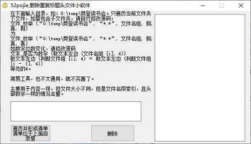 删除重复标题头文件小软件官方版是一款可以根据文件名删除重复文件的软件,主要原理是根据文件名首部数字判断文件是否相同,然后删除文件名短的一个,它的删除功能很有针对性。