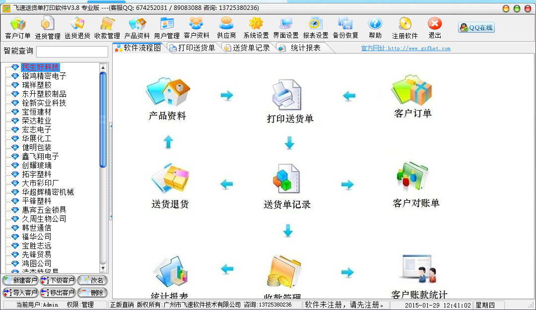 飞速送货单打印管理软件适合各行业的工厂企业、公司、仓库、批发及个人的送货单打印使用,可以直接用鼠标移动客户进行分类等,软件根据客户建立对应送货清单(可以设置自动清除),每个客户送货清单一目了然,送货清单只需建立一次,自动保存最后一次出货的单价、折扣等,下次只需输入送货数量,即可打印出送货单,自动备份数据库等。