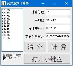 变异系数计算器最新版是一款灵活小巧,且简单实用的系数计算工具,变异系数计算器最新版可以帮助用户计算出平均数、标准差、变异系数。打开小键盘,功能不支持WIN10系统,把需要计算的数值输入在左边的编辑框,每个数之间用换行符隔开,最后一个数输入完成不用换行!