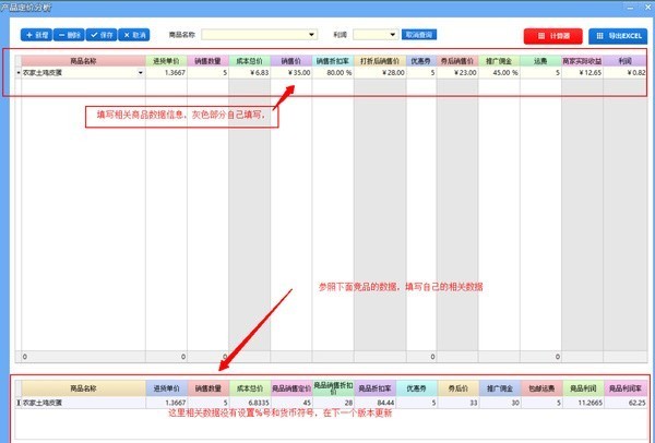 3、针对竟品数据,输入自己的定价,在做出调整计算出利润点