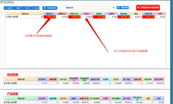 2、找到你竟争店铺的数据,填写相关数据,需要说明,竟针对手的进货价是参照你的进货成本定价的