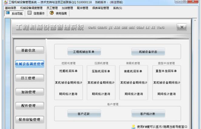 《工程机械设备管理系统》是适用于为工程项目出租机械设备的公司,它主要包括基础信息(机械设备档案、供商信息、客户信息),机械设备调度管理(工程机械出车单、挖掘机管理(挖掘机回车单、某机械设备期间统计、期间统计查询)、压路机管理(压路机回车单、某机械设备期间统计、期间统计查询)、装载机管理(装载机回车单、某机械设备期间统计、期间统计查询)、重型半挂管理(重型半挂回车单、某机械设备期间统计、期间统计查询)、客户管理(客户还款、客户统计表)、机械设备状态),员工管理(员工登记、事故登记、员工考勤、员工生日提醒),加油管理(加油登记、加油统计、余油统计),配件管理(配件信息、配件入库、维护领料、配件库存、旧件回收、采购申请单、采购申请明细),保养审验管理(设备保养登记、设备审验登记、设备审验提醒、保养期间查询)。软件界面设计简洁、美观、其人性化的管理可以使用户轻易上手,提升服务质量,提高工作效率,是协助每个工程机械设备出租公司合理和优化管理的好帮手!