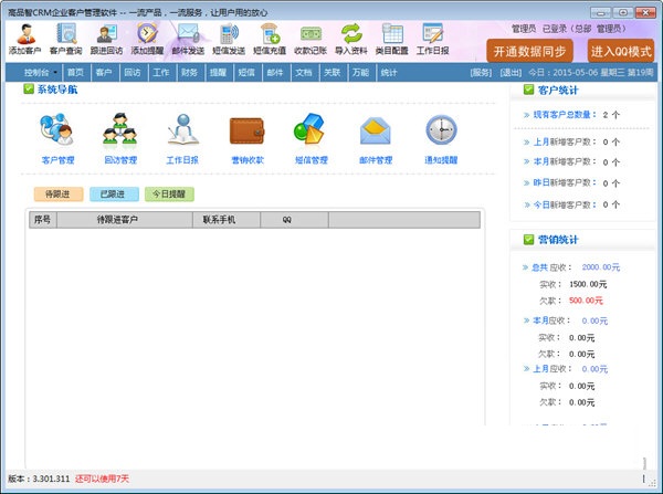1、客户管理:潜在客户、客户回访、客户导入、客户导出、客户统计;