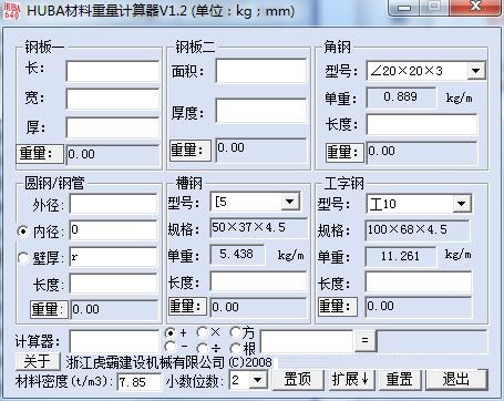 huba材料重量计算器最新版是一款操作简单的材料称重计算工具。huba材料重量计算器官方版可以计算钢板、角钢、圆钢/钢管,槽钢和工字钢等,用户只需输入对应的参数就可快速得出结果。huba材料重量计算器还内置计算器,支持加、减、乘、除、方、根的计算。其程序汇入了绝大多数常用材料的理论重量计算,约18类。